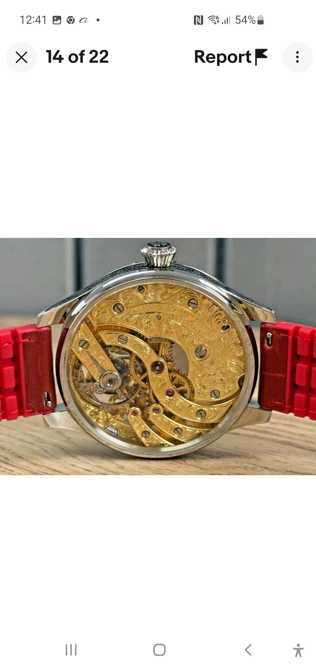 BEAUTIFUL PATEK PHILIPPE LEVER POCKET-WATCH MOVEMENT NO.194784, EXPERTLY RECASED INTO A WRISTWATCH AND PAIRED WITH A SKELETONISED DIAL. THE WATCH FEATURES A BOLD GOLD DIAL WITH A BEAUTIFUL RED ORNAMENTAL DESIGN OF THE ICONIC LOGO FILLED WITH RED GEMSTONES/DIAMONDS AND DISTINCTIVE RED GEMSTONE INDICES WITH THE PATEK WORDING BORDERING THE BEZEL.THE STUNNING 1924 PATEK PHILLIPE MOVEMENT IS SHOWCASED THROUGH AN EXHIBITION CASE BACK, ALLOWING THE EXCEPTIONAL CRAFTSMANSHIP TO BE FULLY APPRECIATED.THE WATCH IS HOUSED IN A HIGH-QUALITY ENGRAVED STAINLESS-STEEL CASE AND IS FITTED WITH A NEW RED LEATHER STRAP. THE CRAFTSMANSHIP AND PRESENTATION ARE TRULY STUNNING.THE MOVEMENT HAS BEEN FULLY SERVICED AND THE WATCH COMES PRESENTED IN A QUALITY AFTERMARKET BOX AS PICTURE ALONG WITH A MOVEMENT AUTHENTICATION CARD.BUY WITH CONFIDENCE FROM A 100% RATED SELLER FOR THE LAST 20 YEARS.THE WATCH WILL BE POSTED VIA ROYAL MAIL NEXT DAY DELIVERY BEFORE 1PM.