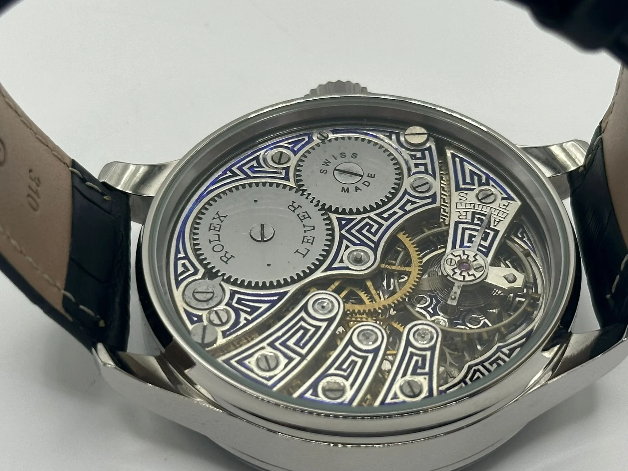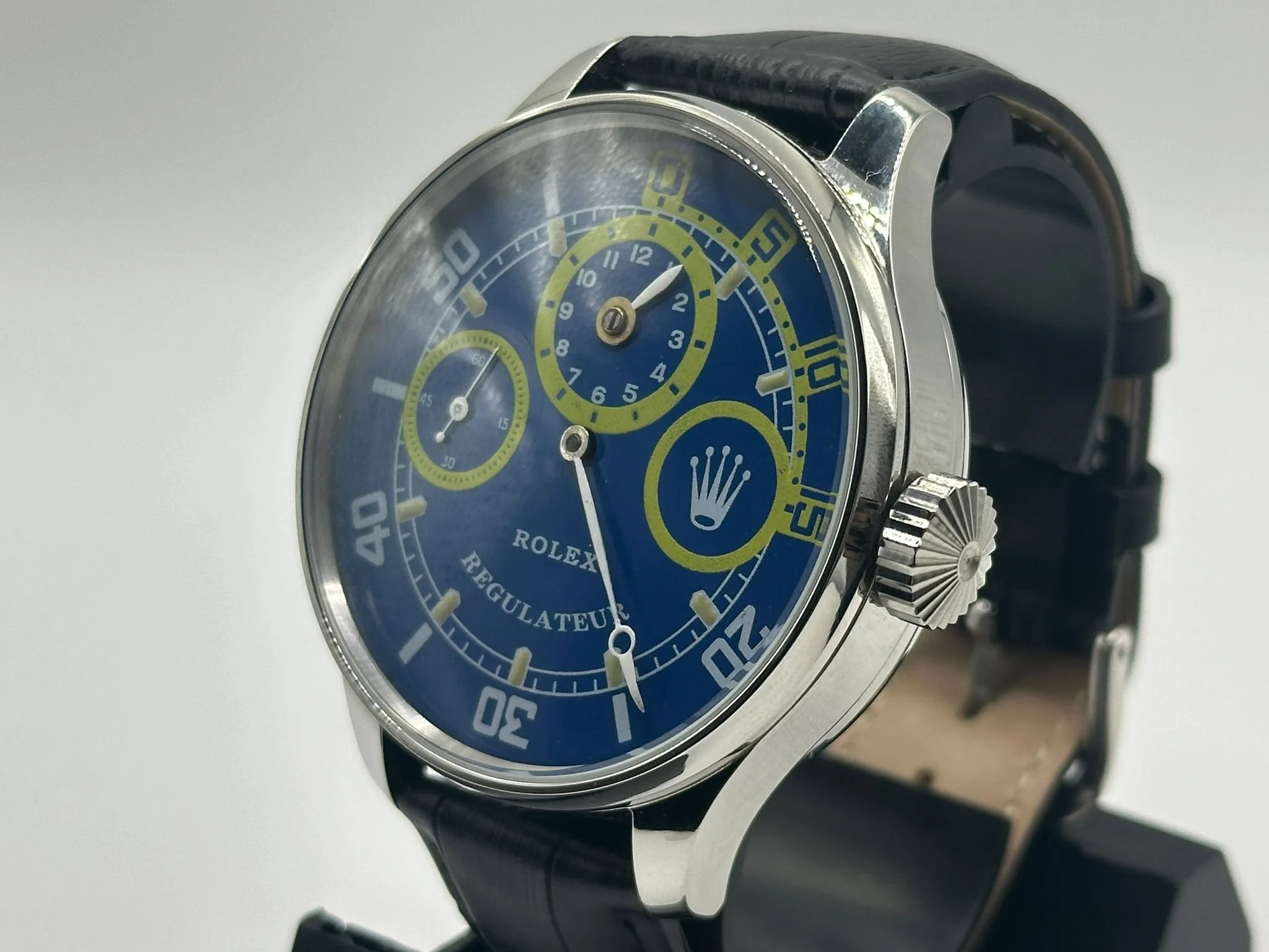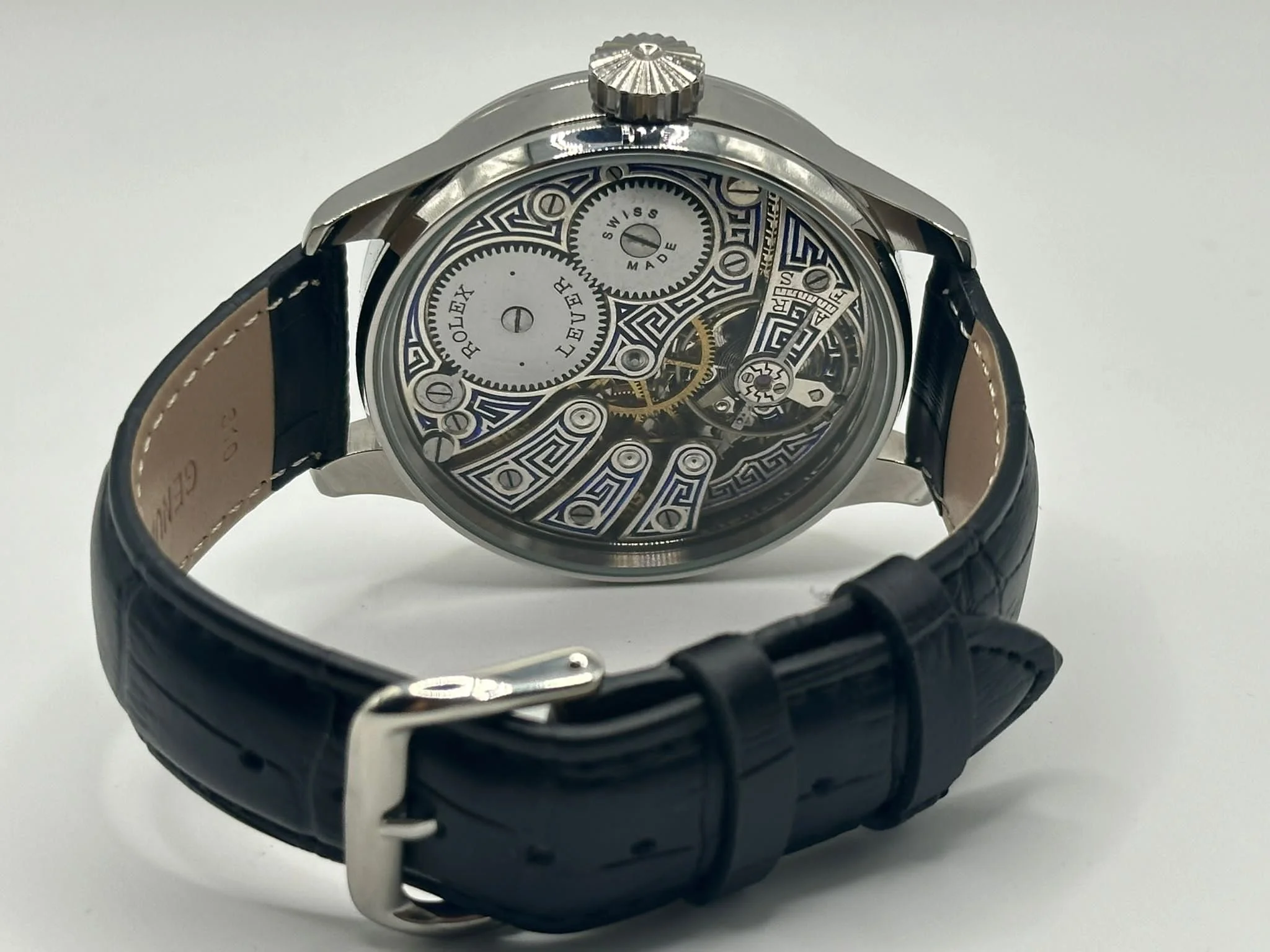 Beautifully engraved movement. Stunning exhibition back case to show off the Rolex lever 15 jewels movement. Superb custom regulator dial. 47mm hand engraved stainless steel case and 22 mm lug width. Green leather strap with stainless steel buckle. Presented in quality inner and outer display box with movement authenticity card.