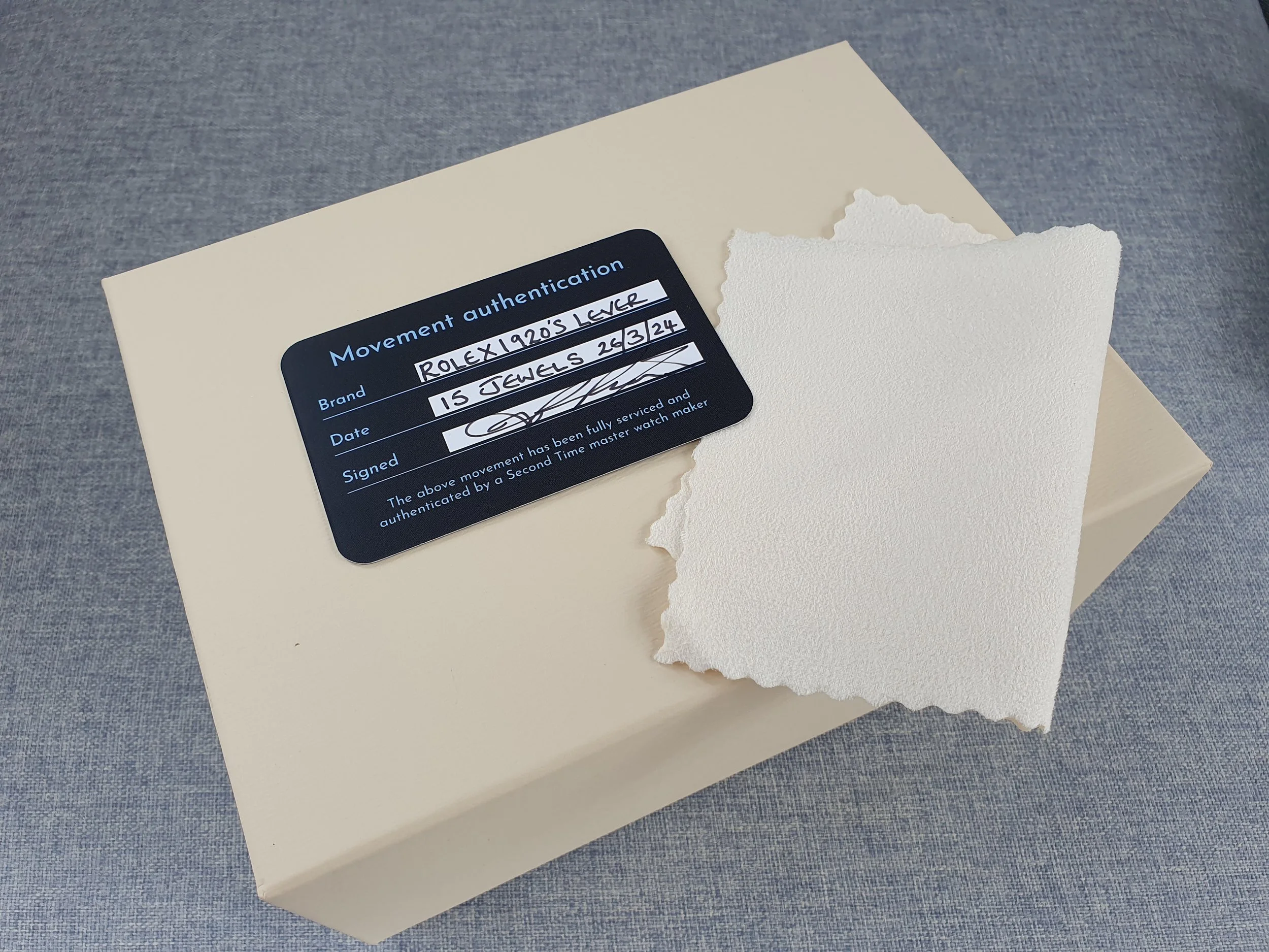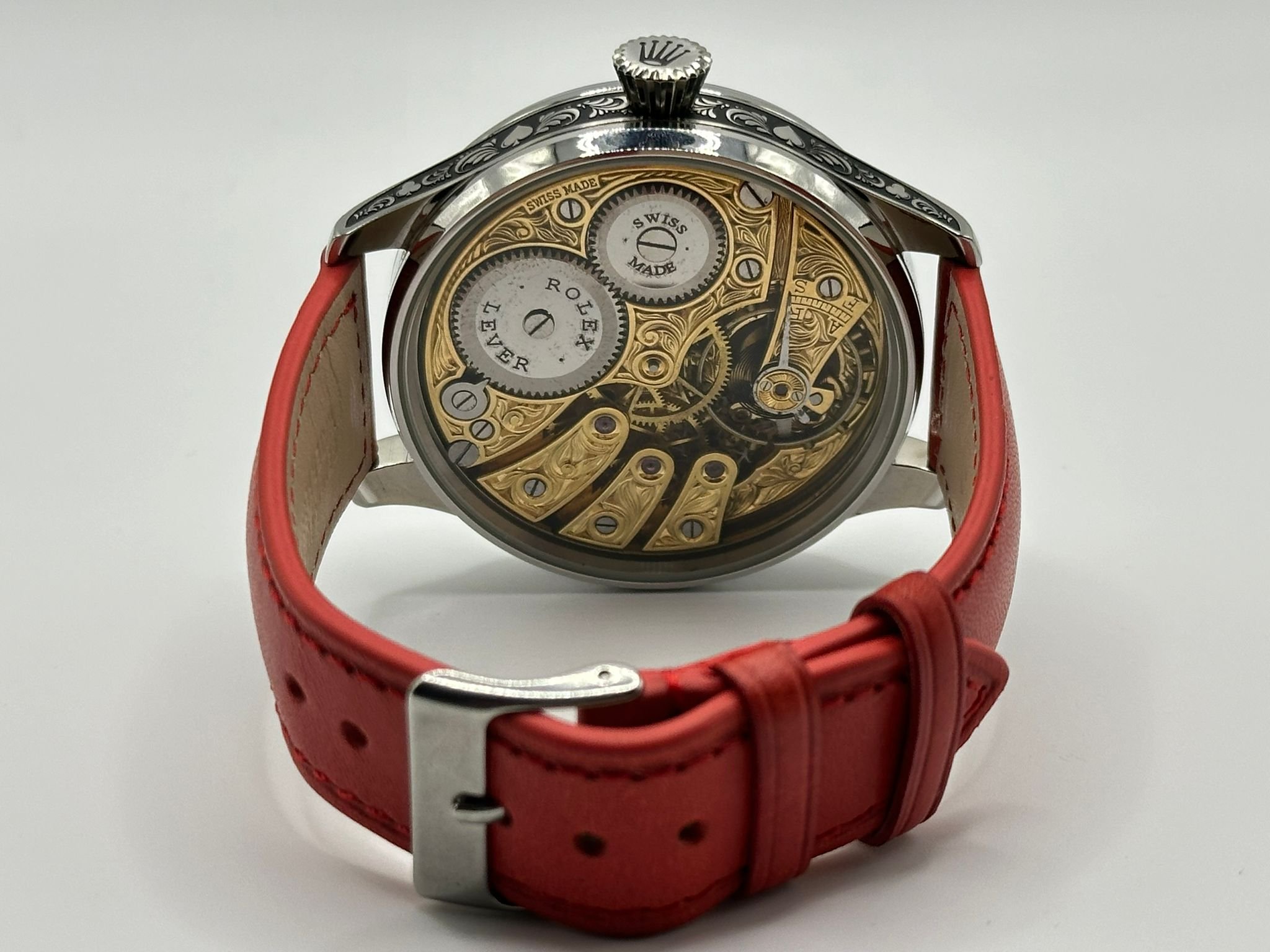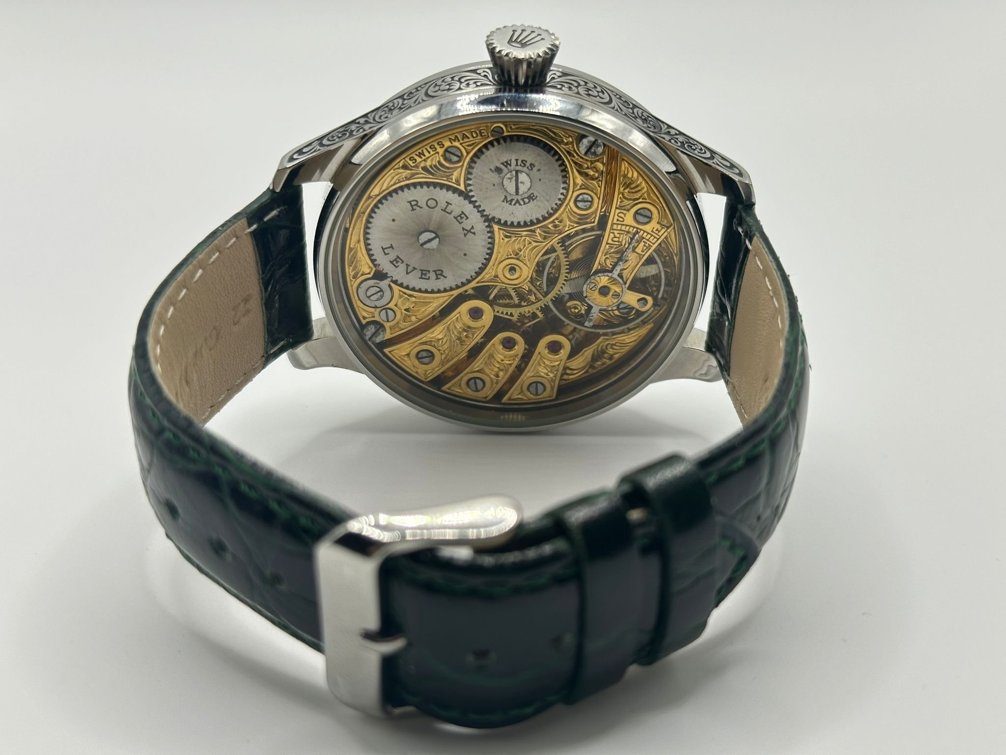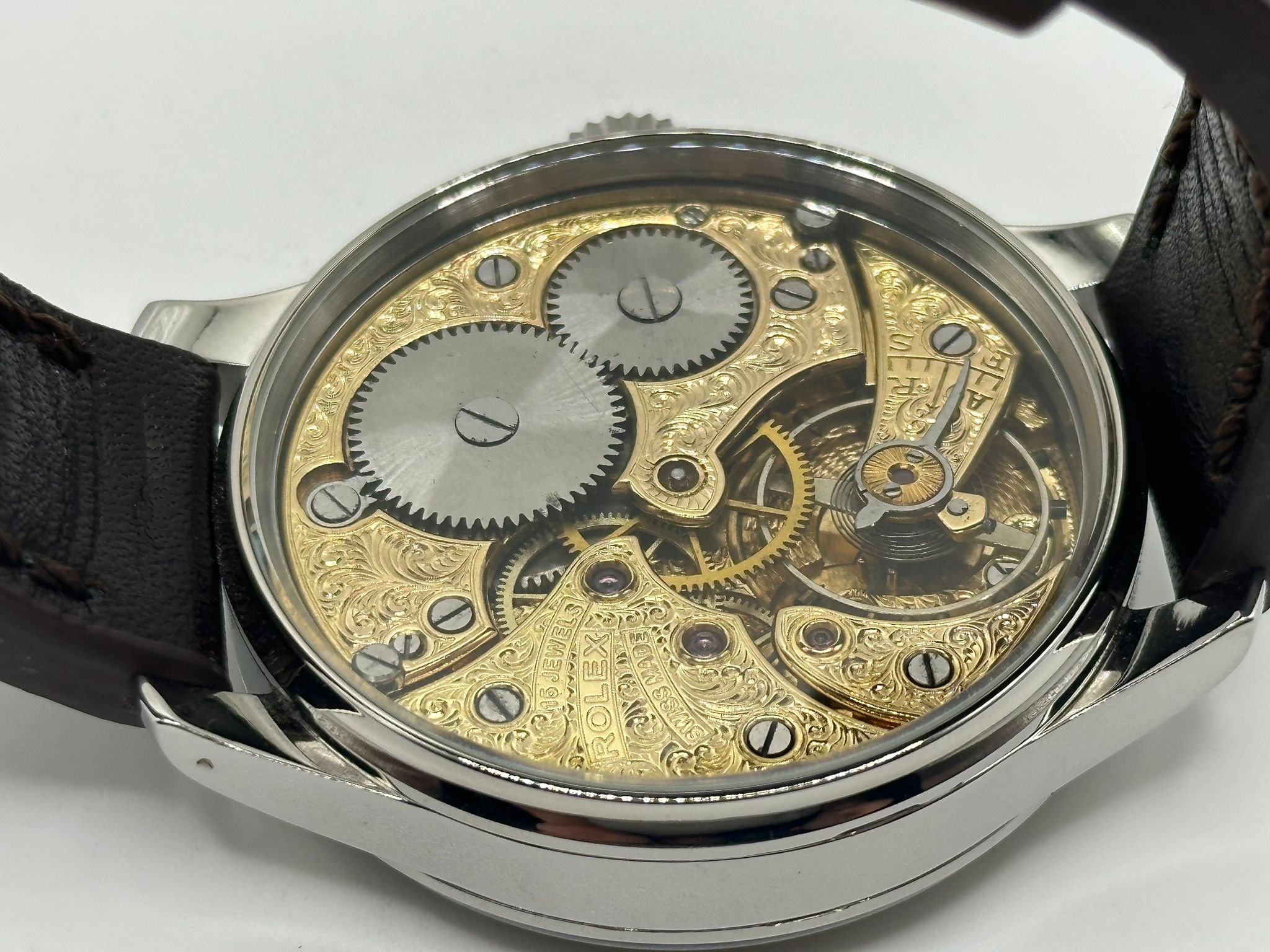 The concept is very exciting. You take a vintage watch and give it a modern twist. It’s as simple as converting a pocket watch into a wristwatch, but the process requires amazing skills and craftsmanship, all of our watch movements are completely stripped down, individually engraved, gold-plated and serviced, any parts that are worn are changed like for like or a new part is hand made. We always use original dials where ever possible and restore or refinish them and restore the brand name, if the dial can’t be restored it is completely skeletonised with no brand. All of our 1920’s Rolex lever watches come presented in a quality inner and outer box pictured above with movement authenticity card.