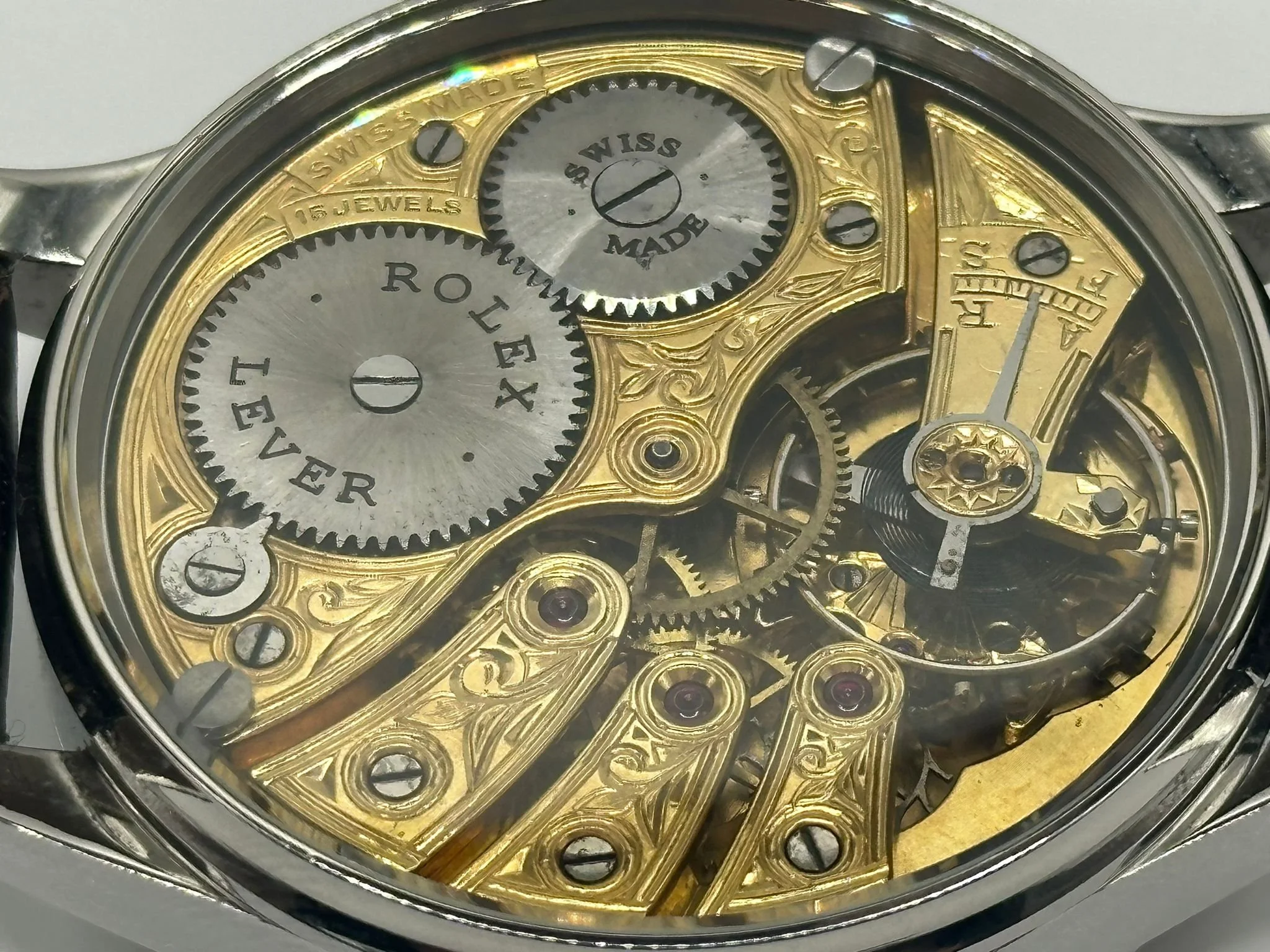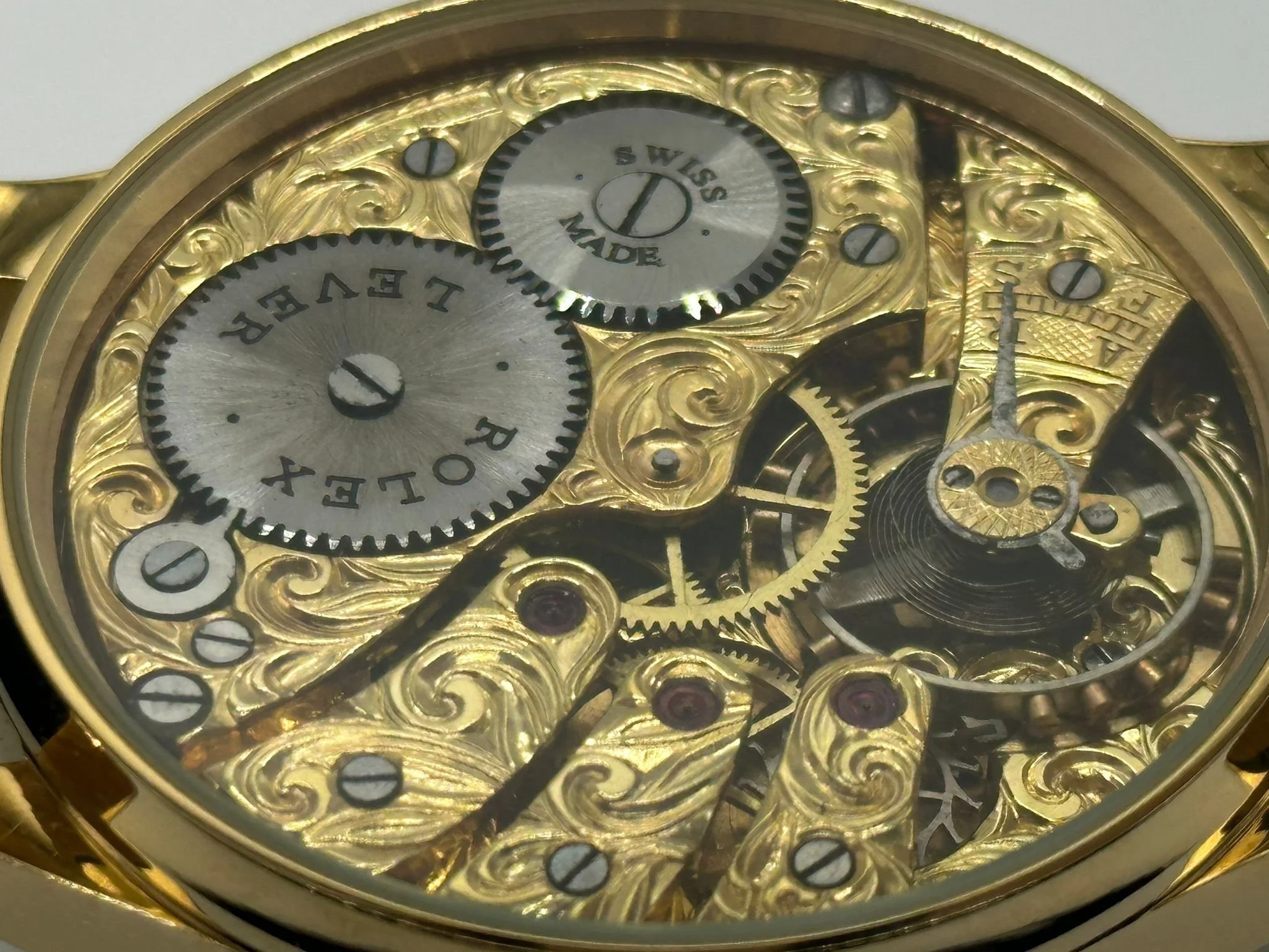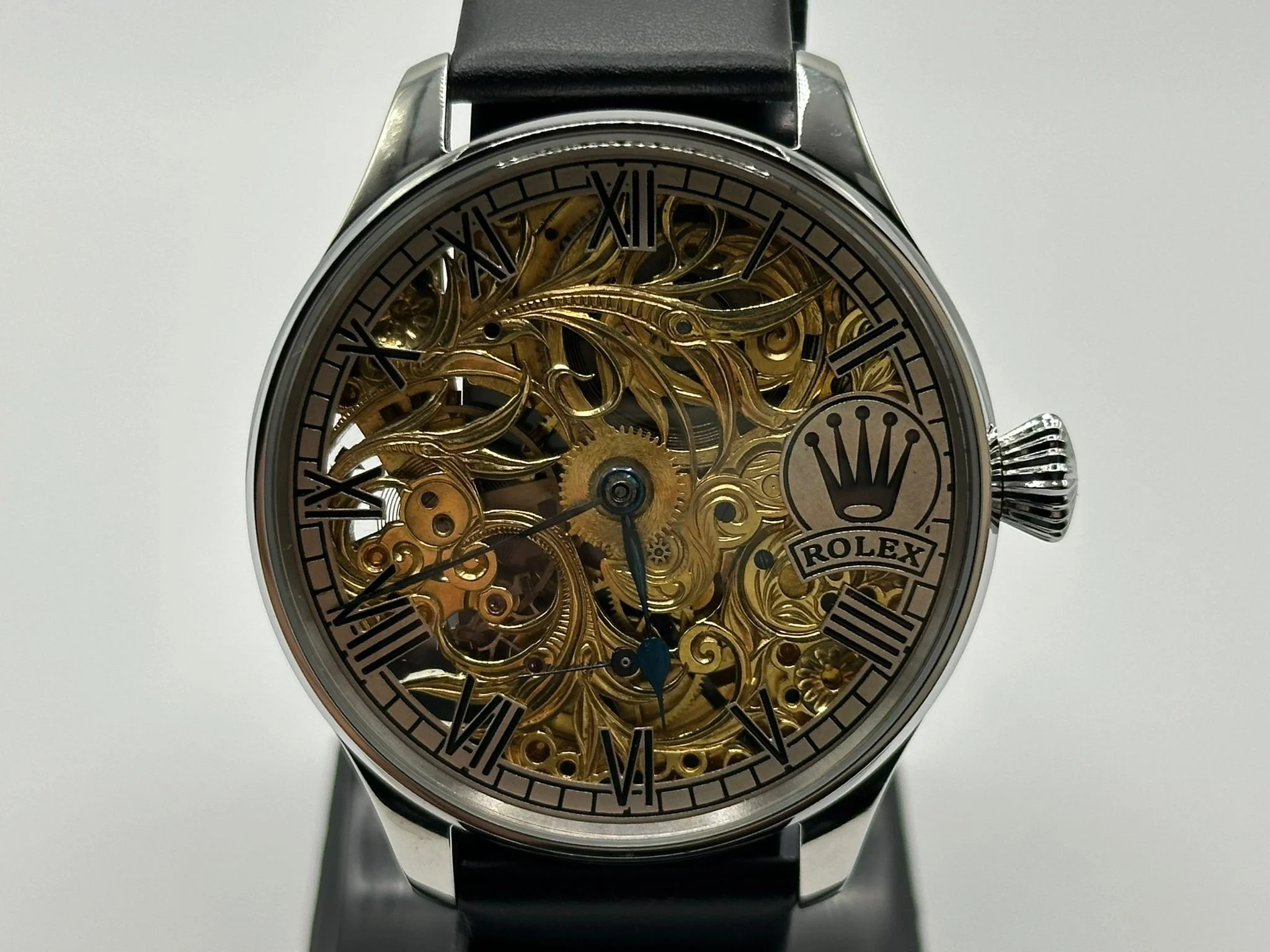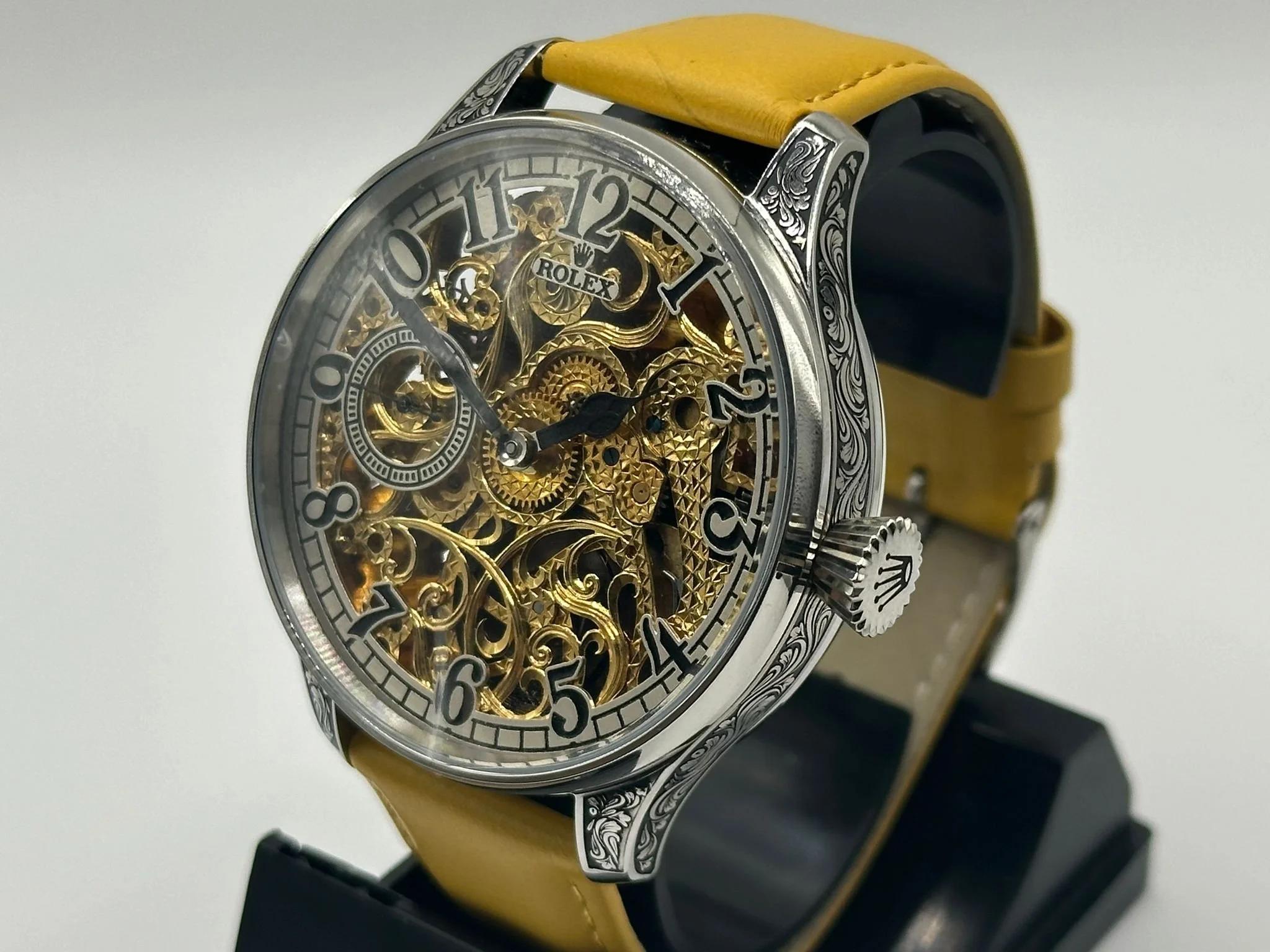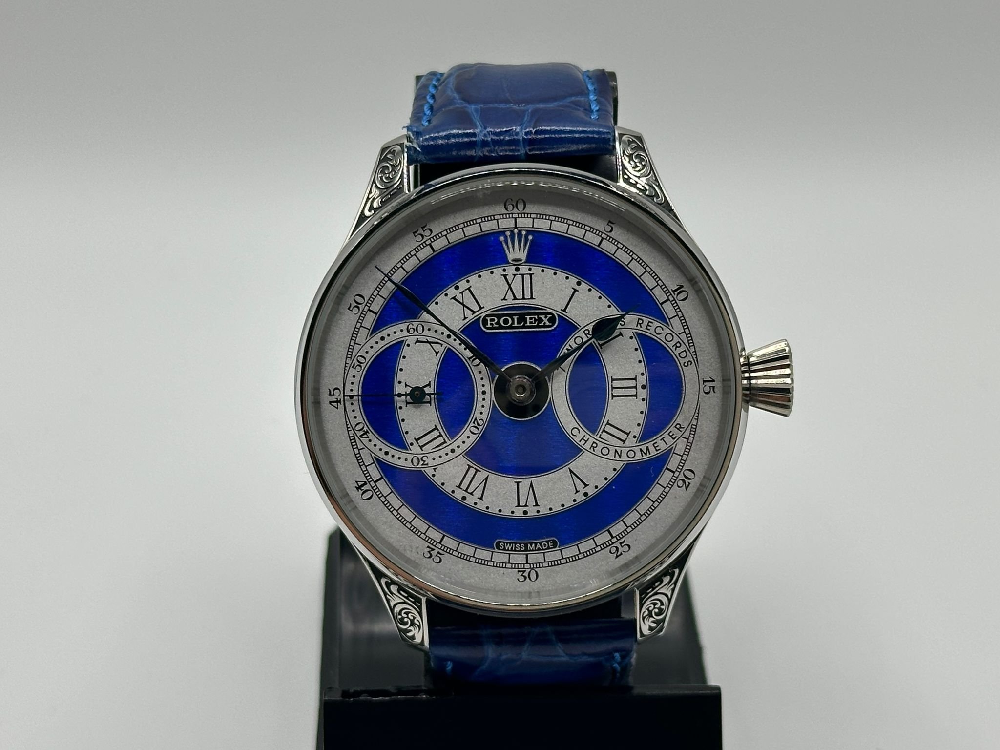 The concept is very exciting. You take a vintage watch and give it a modern twist. It’s as simple as converting a pocket watch into a wristwatch, but the process requires amazing skills and craftsmanship, all of our watch movements are completely stripped down, individually engraved, gold-plated and serviced, any parts that are worn are changed like for like or a new part is hand made. We always use original dials where ever possible and restore or refinish them and restore the brand name, if the dial can’t be restored it is completely skeletonised with no brand. All of our 1920’s Rolex lever watches come presented in a quality inner and outer box pictured above with movement authenticity card.