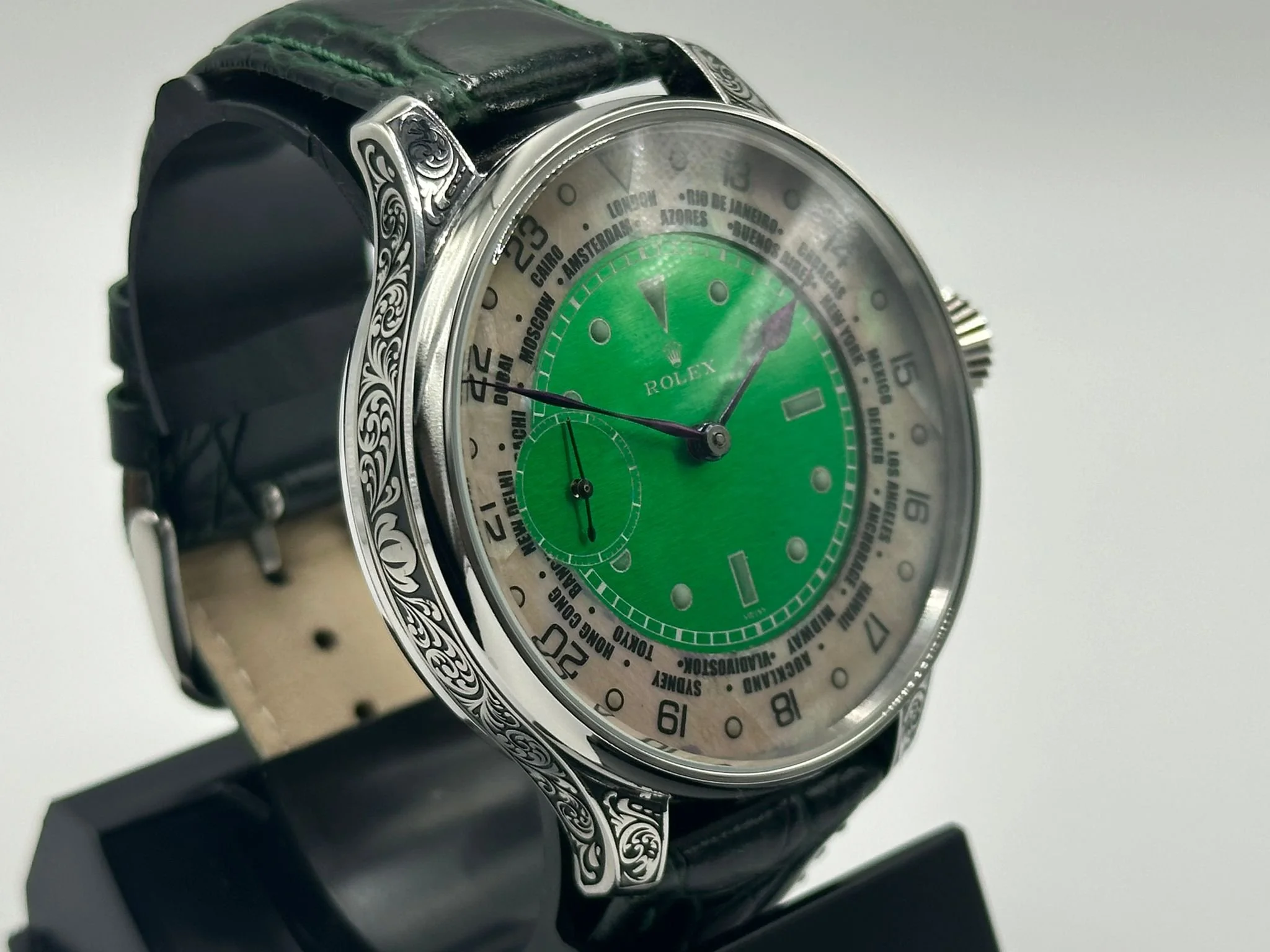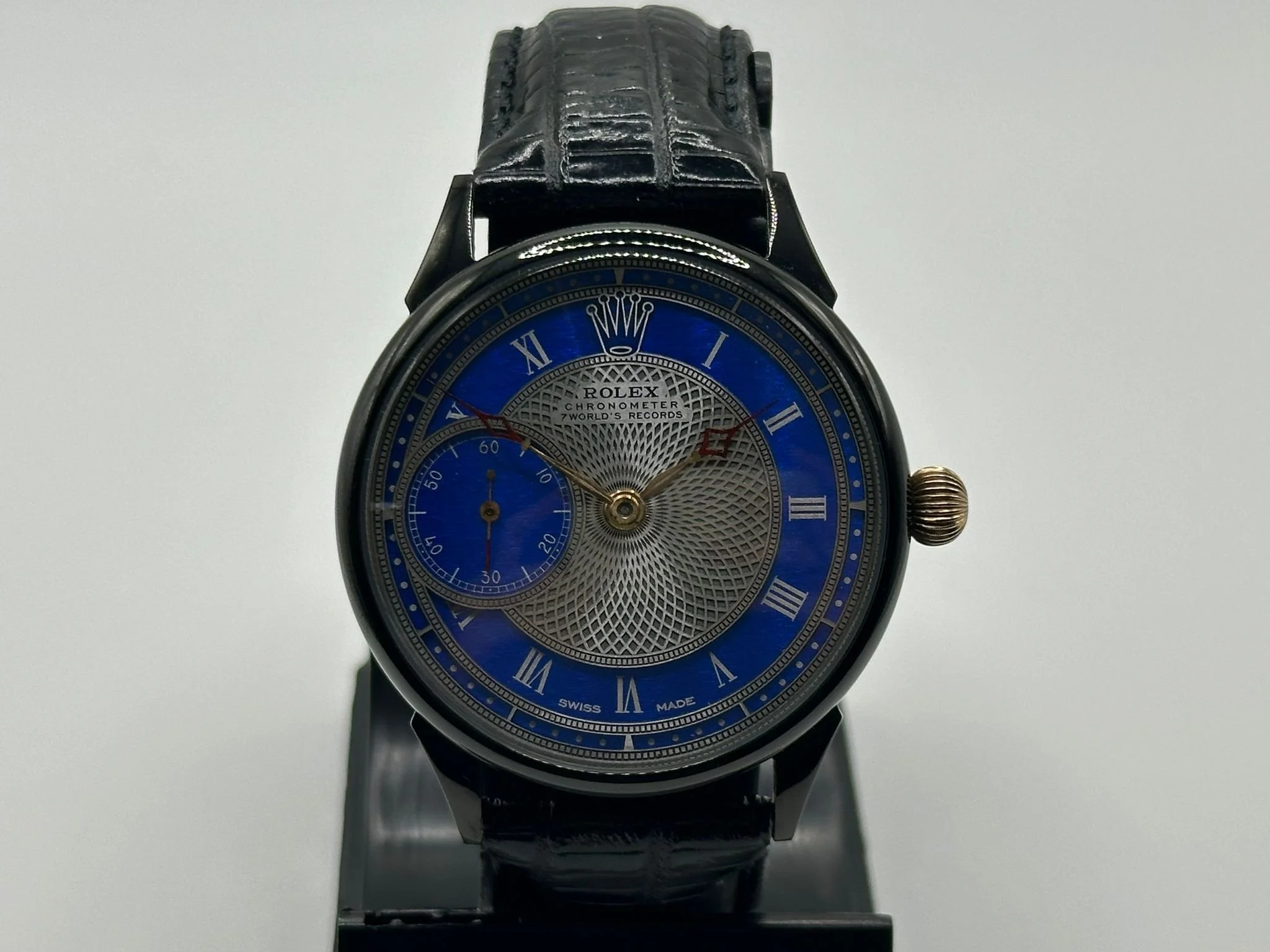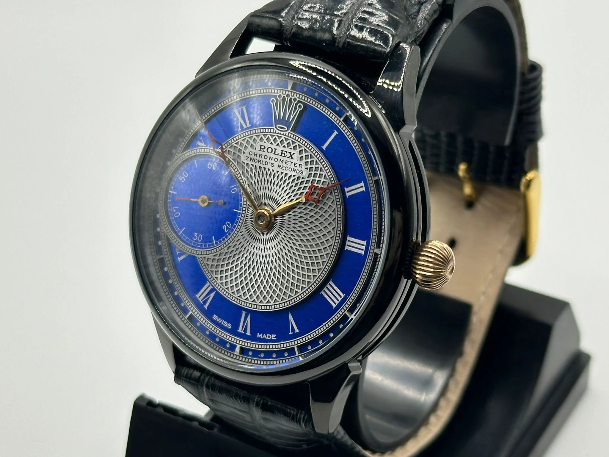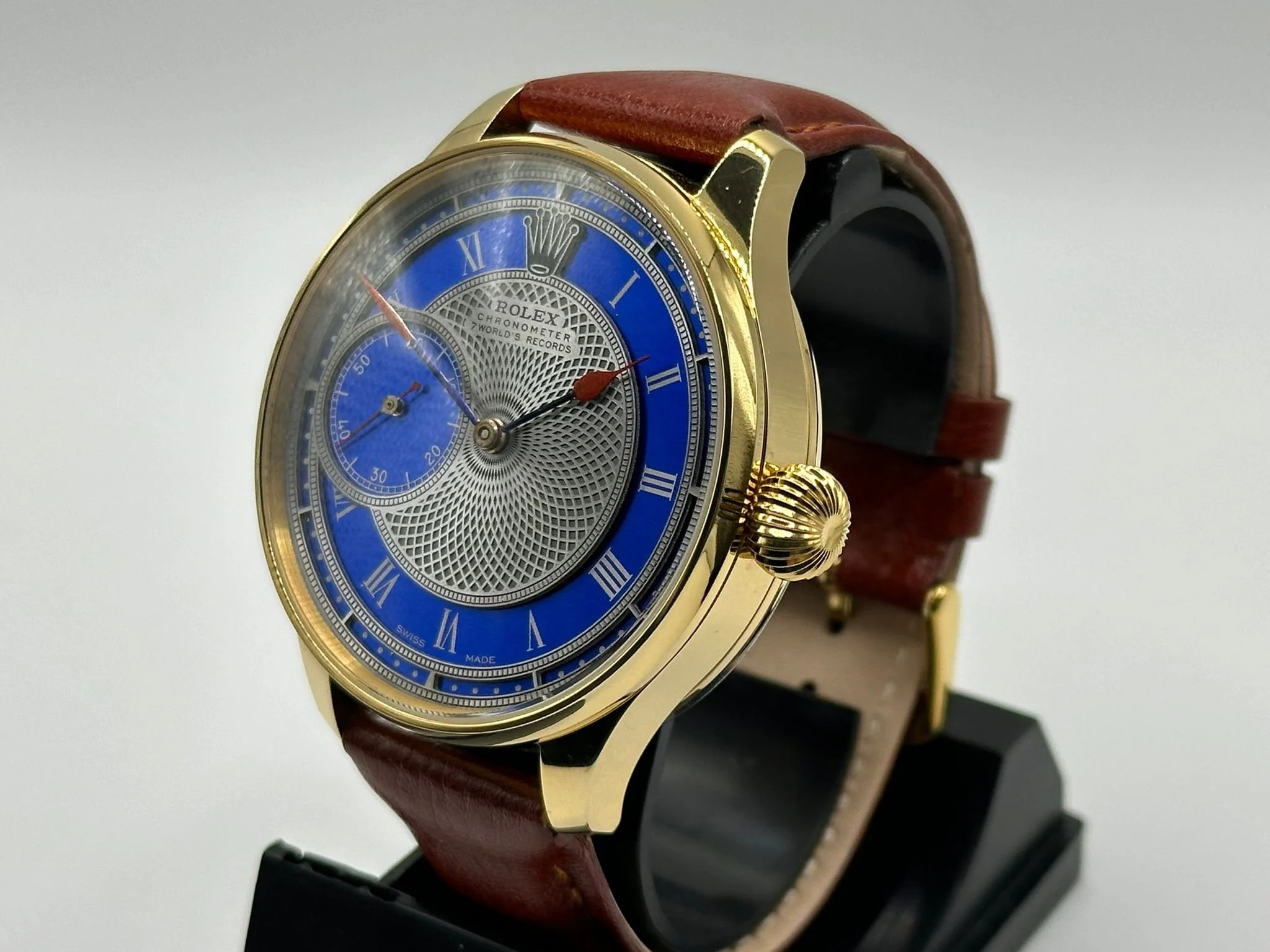 The concept is very exciting. You take a vintage watch and give it a modern twist. It’s as simple as converting a pocket watch into a wristwatch, but the process requires amazing skills and craftsmanship, all of our watch movements are completely stripped down, individually engraved, gold-plated and serviced, any parts that are worn are changed like for like or a new part is hand made. We always use original dials where ever possible and restore or refinish them and restore the brand name, if the dial can’t be restored it is completely skeletonised with no brand. All of our 1920’s Rolex lever watches come presented in a quality inner and outer box pictured above with movement authenticity card.